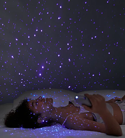 Realza los momentos íntimos con una exhibición de luces estrelladas proyectadas hacia el cielo desde la base de Pulse Galaxie. Simplemente retira el estimulador de la base, enciende el proyector y elige entre 3 modos de luz en majestuosos tonos púrpura. Cuando el estimulador y la base están unidos, el diseño ovalado se asemeja a una decoración elegante para el hogar.