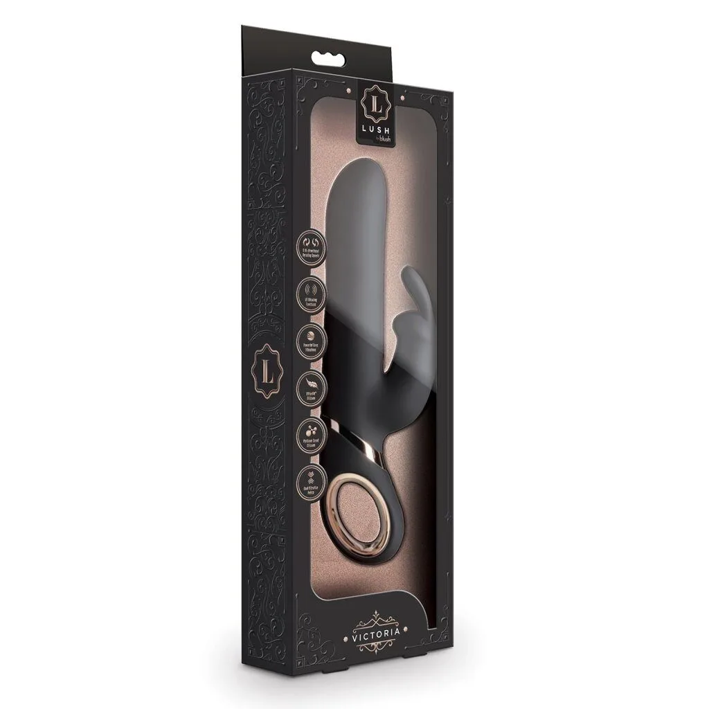 ¡Vive exuberantemente! Victoria es un Vibrador conejito rotador The Luxe, que gira con 3 potentes motores listos para ofrecer placer. ¡Hay 6 funciones de giro que son reversibles según se desee para una estimulación óptima del punto G, y 13 potentes funciones de vibración para elegir! Victoria también tiene una función de bloqueo de viaje para que puedas llevarlo contigo a cualquier parte. ¡Este conejo recargable por USB es resistente al agua IPX7 para una fácil limpieza y jugar en el baño o la ducha! Fabricado en silicona platino, suave y satinada. Victoria es segura para el cuerpo, libre de ftalatos, libre de látex y lista para deleitarse. Silicona pura con platino. Ultra seda suave. 3 potentes motores para ofrecer un placer increíble. 6 funciones de giro. Giro reversibles13. Potentes funciones de vibración en el eje y el estimulador del clítoris. USB recargable IPX7 resistente al agua. Longitud 9 pulgadas / 22,8 cm Longitud insertable 4,5 pulgadas / 11,4 cm Ancho 1,5 pulgadas / 3,8 cm